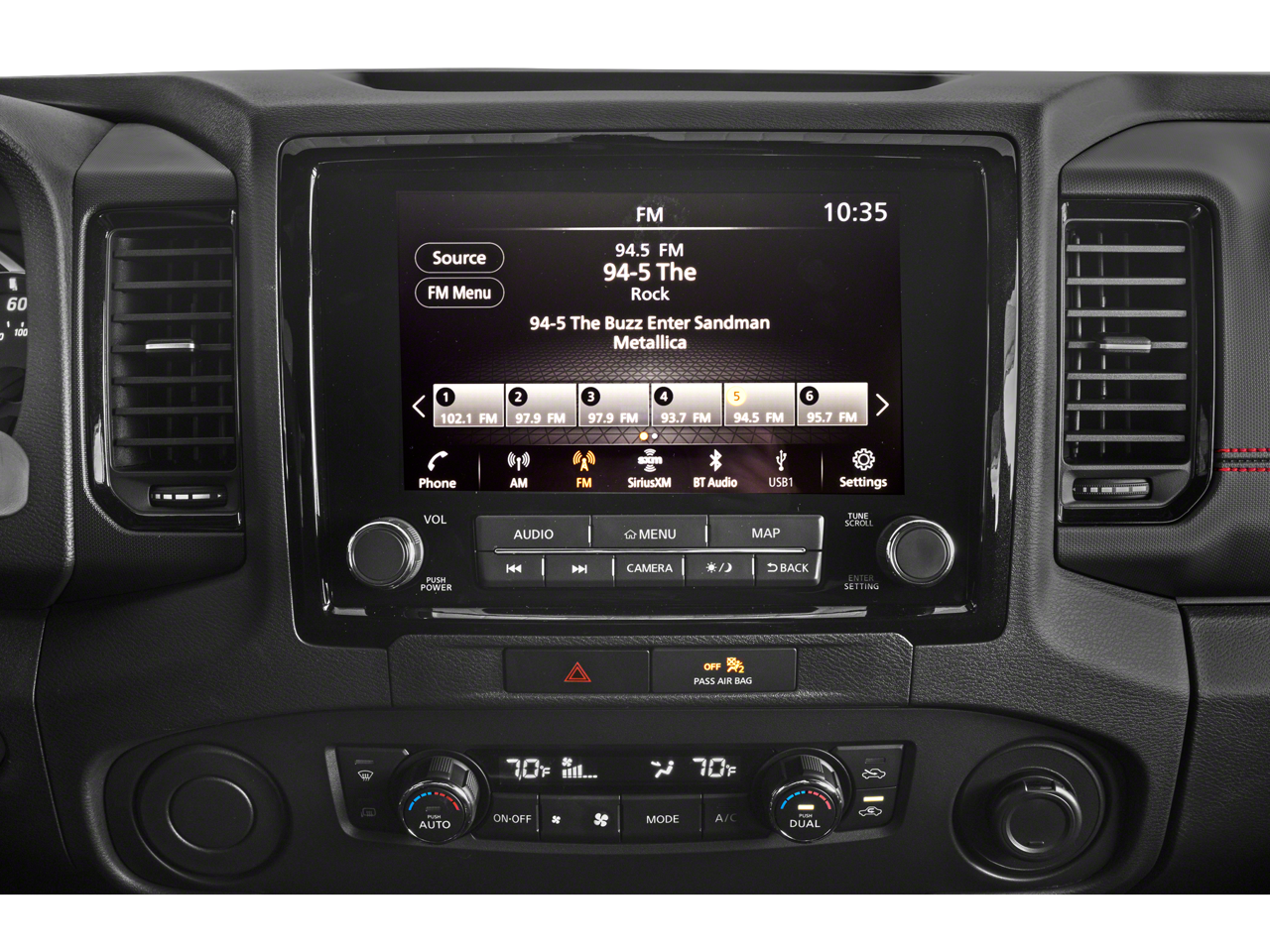 - Radio: 1CD/SXM/AM/FM/AUX/USB/MP3/WMA Audio System -inc: 6 speakers, 9.0" color touch-screen display, wireless Apple CarPlay, Android Auto, Bluetooth® hands-free phone system and streaming (audio or text message), voice recognition for audio features, Siri Eyes Free, SiriusXM radio w/advanced audio features, 1 USB-A and 1 USB-C front ports, steering wheel audio controls, Nissan door to door navigation, electronic compass in navigation, NissanConnect services and Wi-Fi hotspot